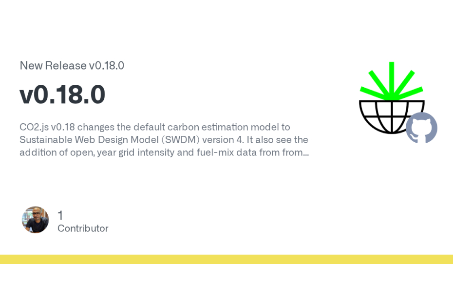 CO2.js v0.18 changes the default carbon estimation model to Sustainable Web Design Model (SWDM) version 4. It also see the addition of open, year grid intensity and fuel-mix data from from Electricity Maps.
